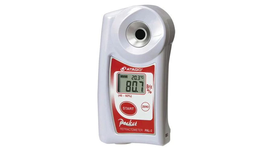 ATAGO PAL-2 digitális refraktométer Brix érték (45-93%, 0,1%) mérésére, 100 mérés rögzítése, NFC adatátvitel. Gyors mérés, egyszerű használat: 2-3 csepp szobahőmérsékletű folyadékot (lekvár, zselé, méz, gyümölcslé koncentrátum) kell a prizmára cseppenteni. A Start gomb megnyomása után Brix érték és a hőmérséklet mérése megtörténik. IP65-ös védettségének köszönhetően nagyon könnyen tisztítható, akár folyóvíz alatt is lemosható. 100 mérés rögzítése (a 101. mérésnél az első mérés lesz felülírva), NFC adatátvitel. Javasoljuk a gyártónál történő garancia regisztrációt (itt), mely után ingyenesen letöltheti az NFC adatátvitelhez készített ATAGO Logger szoftvert.